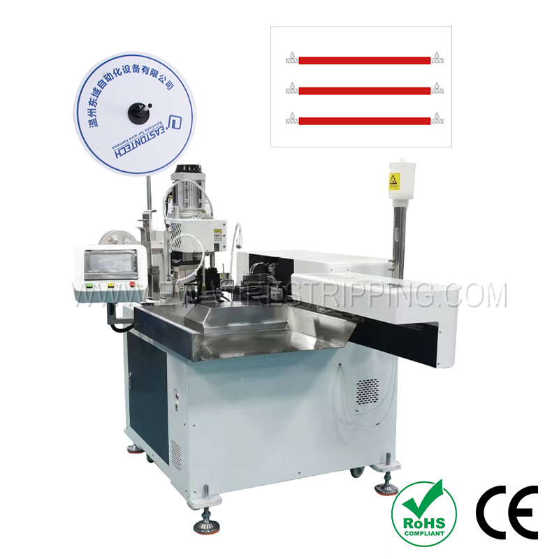 ● The blade size, cutting length, slit depth, slit length, twisting speed, tinning depth, and glue coating depth are all CNC controlled.Quick switching; post-pull cutting to a fixed length, precise and consistent length, and rotary arm take-up.
