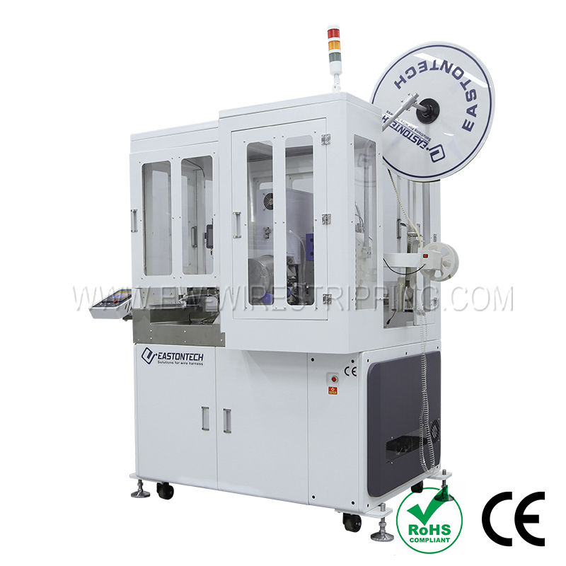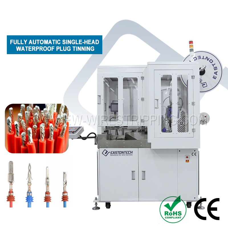 ● Precision translation type single-head waterproof plug tinning machine, which integrates automatic pre-laying, straightening, fixed-length cutting, stripping, crimping end waterproof plug tail rotator wire twisting and tinning, is suitable for high-precision waterproof wire harnesses; cutting depth, wire cutting length, stripping length, crimping end rubber coating depth, waterproof position, twisting tightness and tinning depth are all automatically controlled.