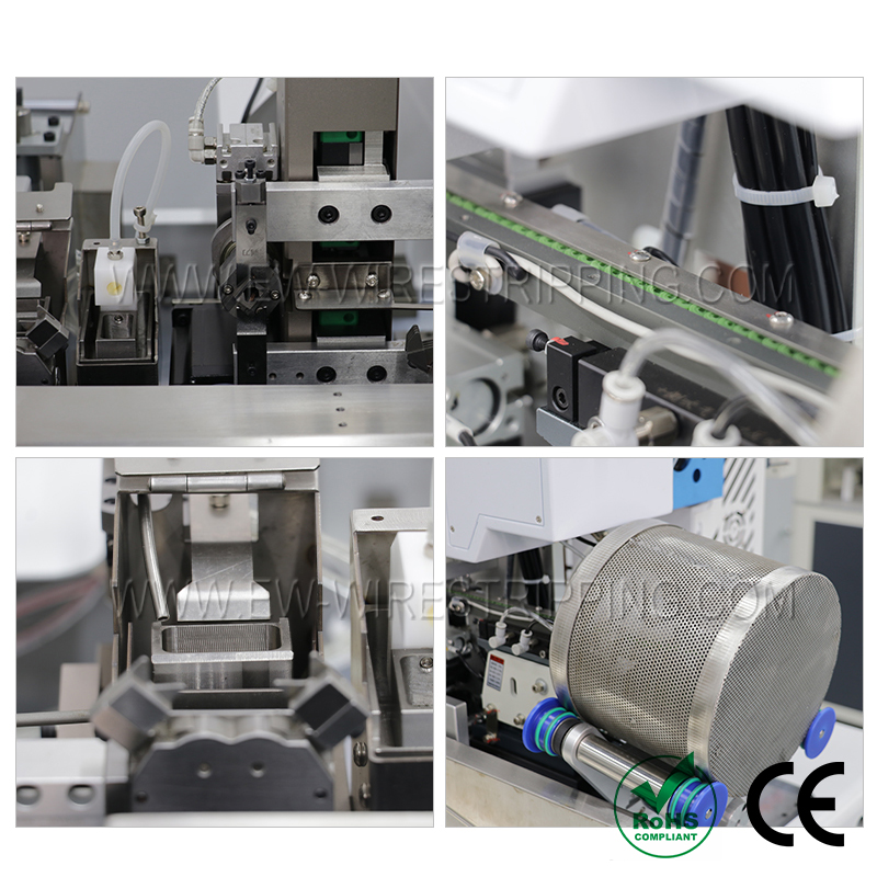 ● The wire wheel fixed length wire feeding and the lead screw slide rail servo work together to achieve the front end stripping, waterproof plug pressing, and tail rotation tinning.
