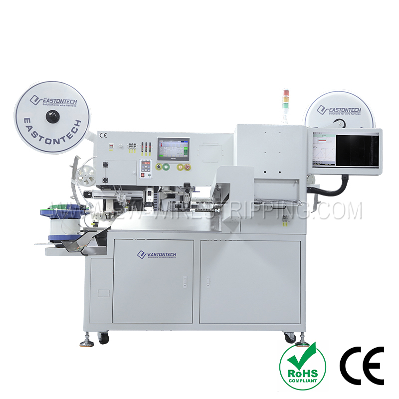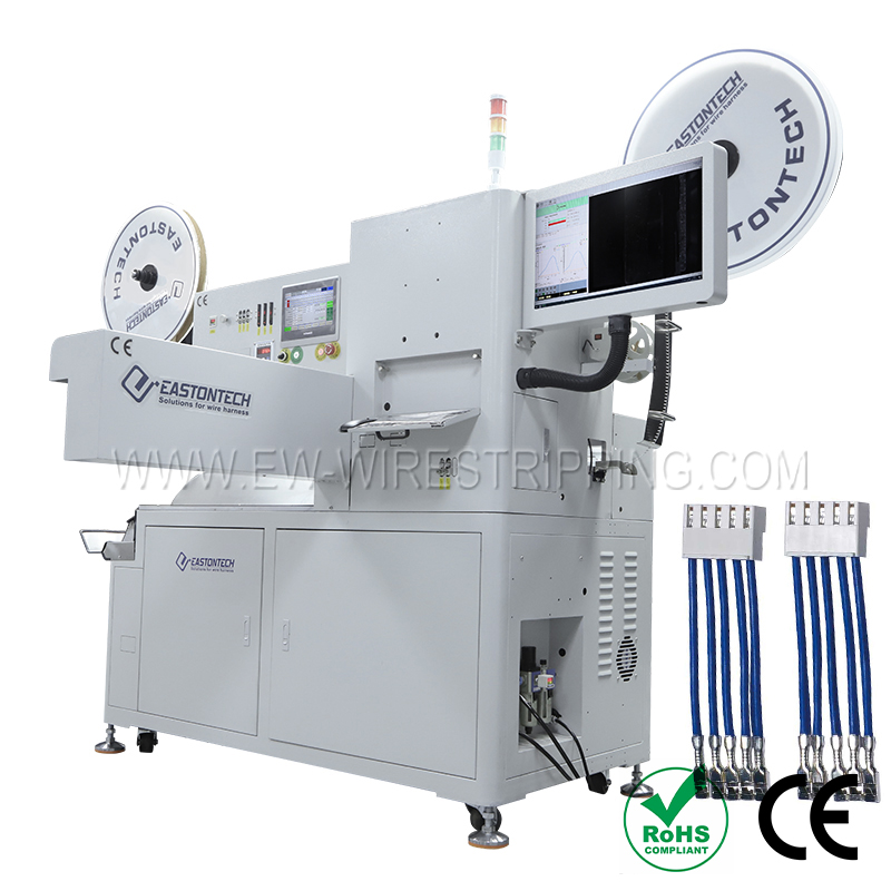 Model EW-8220 is a fully automatic one-head terminal crimping and housing insertion and one head tin soldering machine designed for efficient and precise processing of wire harnesses. It supports 8 colors of wires by default, with the color sequence and usage settings adjustable through the program. The machine is ideal for high-volume production environments where accuracy and reliability are essential.